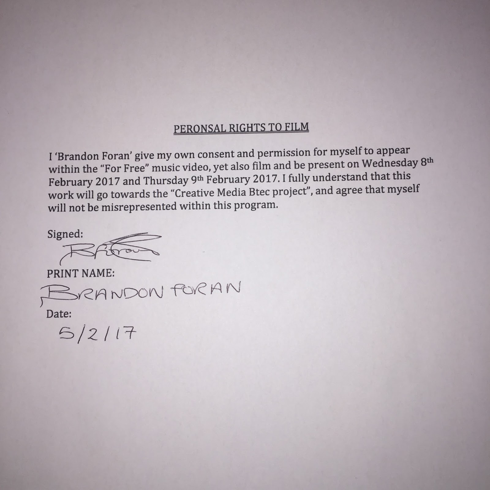 In order to film legally and sufficiently, it is essential to make sure you gain the right permissions to film in order to make sure every has their right authority to make sure they are applicable and give their full consent to film. Within the permission to film it gives permission to film within the given chosen location due to the permission given by the home owner, yet also the personal rights to film which gives the consent that the actors know that the video includes their body, face and voice where this could be streamed and shown to others. Below are the copies of the permissions to film form, now this is complete we have the correct rights to film, within the right locations. As the location does not belong to us ourselves, permission is required as an essential piece of the permission to film.